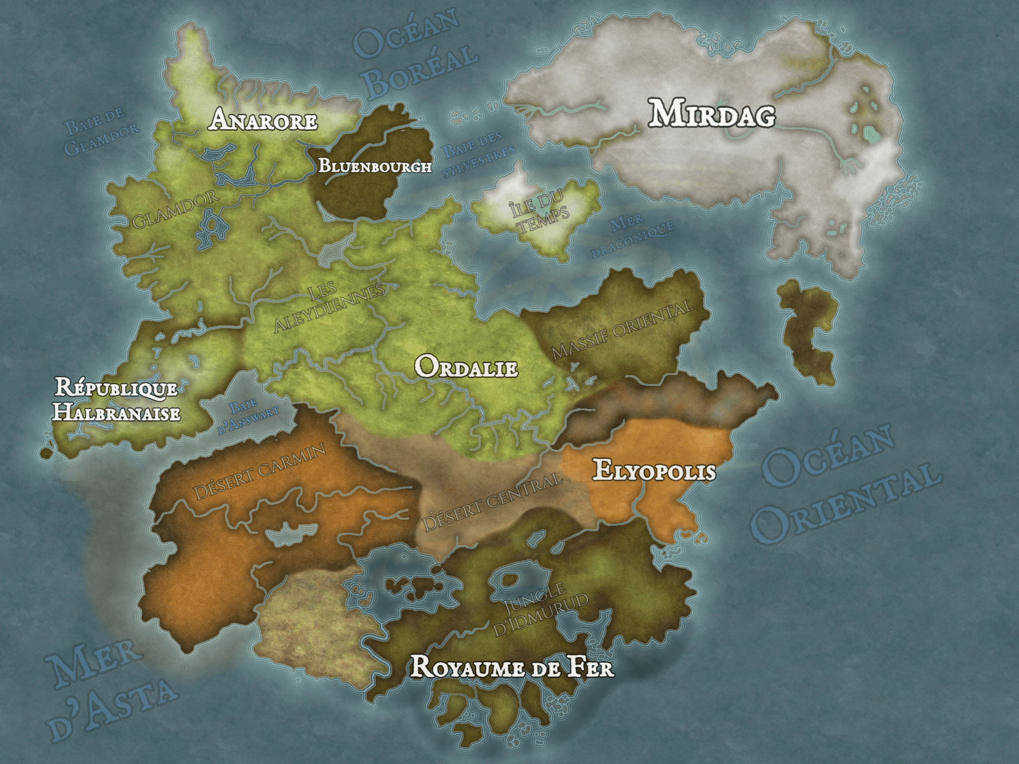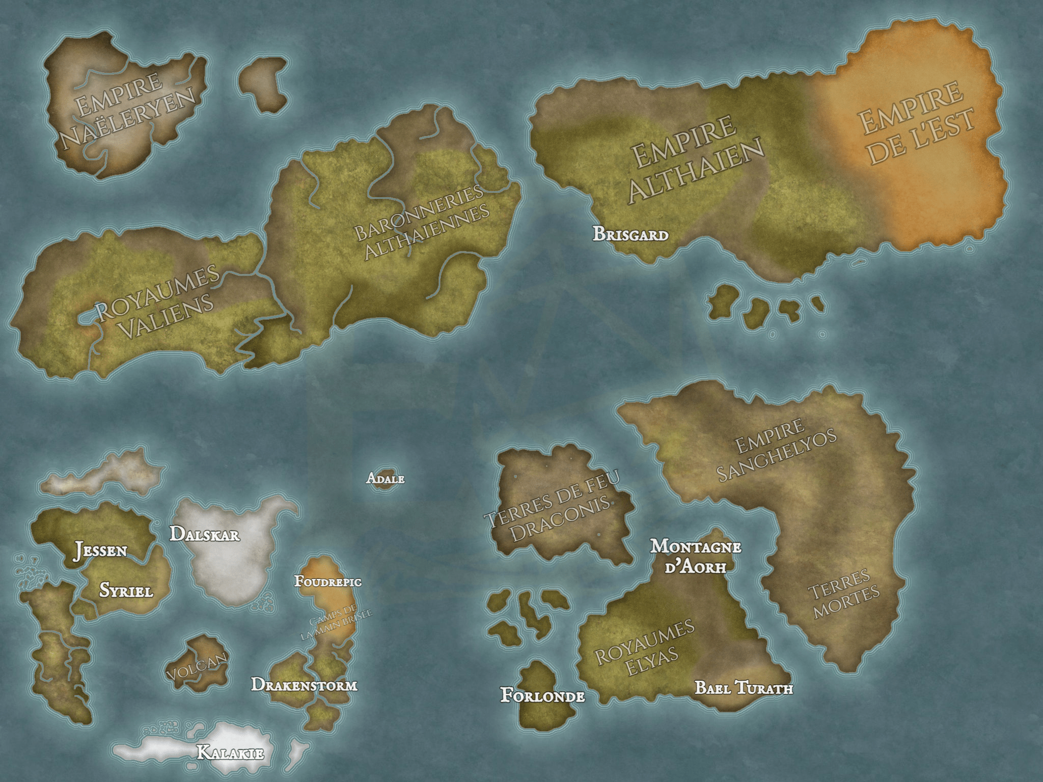 À l’Est d’Ambervale; constituée de larges étendues et d’immenses plateaux verdoyants où ruissellent des fleuves infinis; ses chaînes de montagnes et de volcans sur la côte Ouest forment le territoire Althaïen.L'Empire Naërelyen