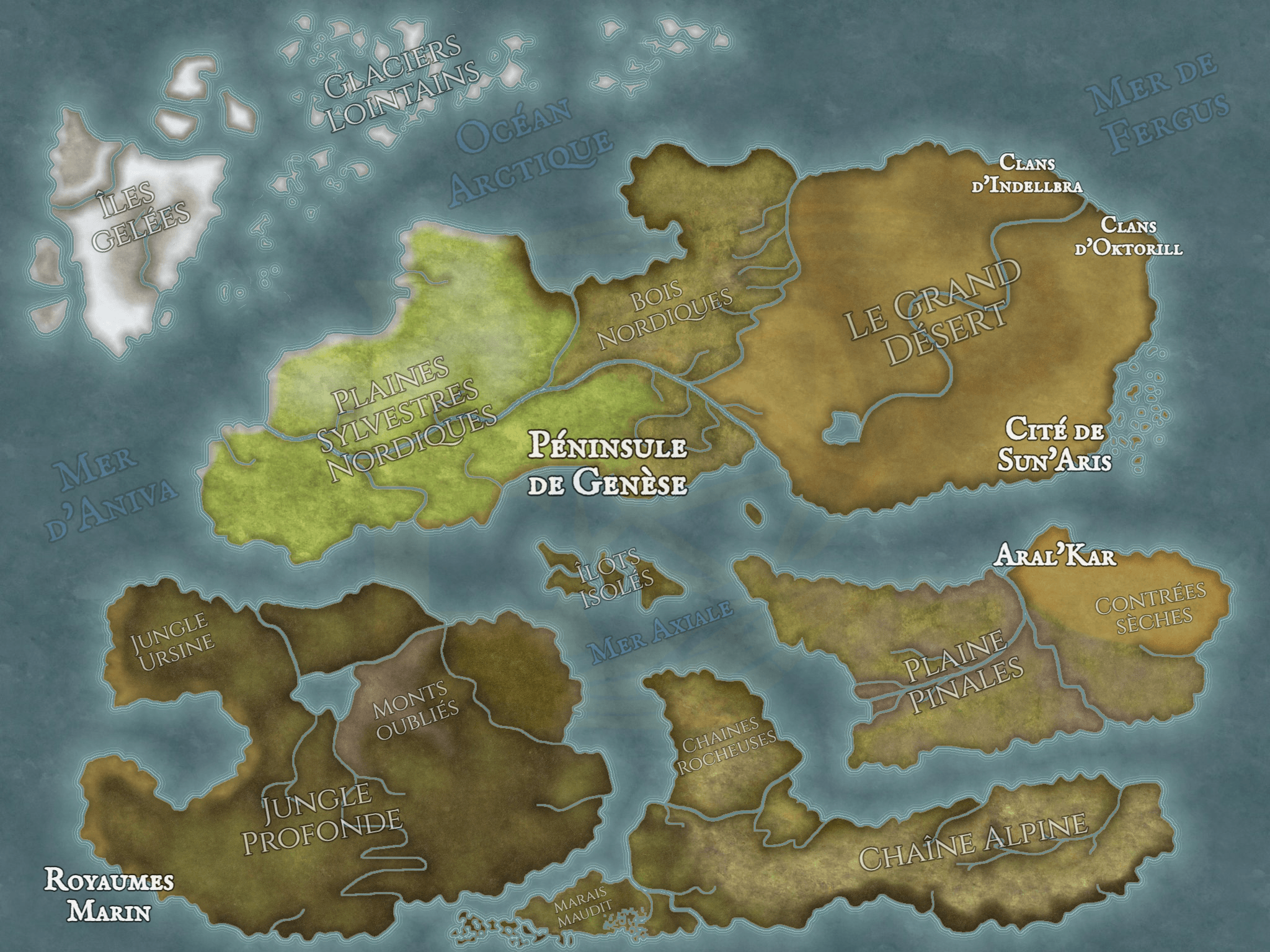 Deux tribus voisines du Grand Désert, nées d'un conflit d'héritage de pouvoirs entre frères il y a +/- 50 ans. Un fleuve, le Sepurath ("veine aride"), forme une jonction entre les territoires. Les deux clans comportent une majorité d'homme-bêtes qui vivent en autarcie via le marchandage, la chasse, l'exploration avec leurs propres cultures, traditions & croyances (dont la divinité mineure, l'Omyul où "idole au médaillon"). Ils sont également à l'origine de l'art martial du Binamu ("coussinets"). La tribu d'Indellbra possède un conseil composé des 4 plus anciens membres du clan tandis qu'Oktorill est dirigé depuis quelques générations par la famille "Iorrah".