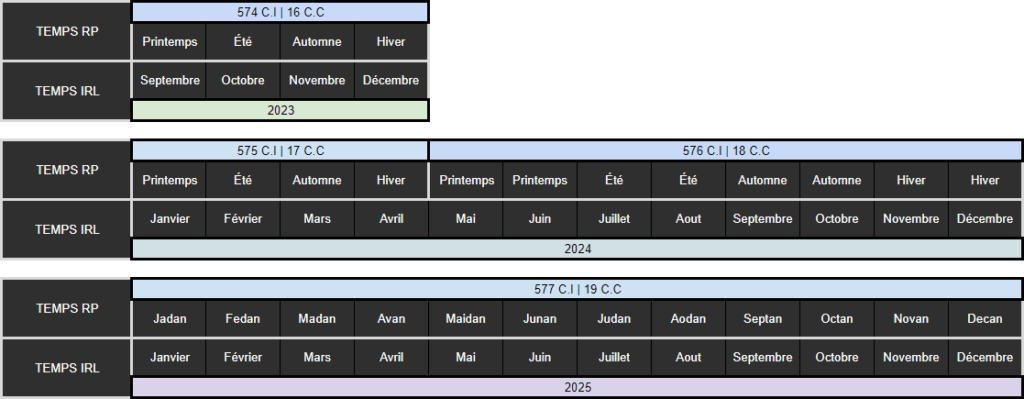 Sur Etherion, le temps s'écoule au même rythme que dans la vraie vie. Vos personnages seront ainsi amenés à grandir avec vous, pour le meilleur ou pour le pire. Vous trouverez ci-dessous une archive du temps passé pour facilité votre perception du temps en jeu (Il est aussi possible de comparer cette archive avec la FRISE CHRONOLOGIQUE disponible sur la page "Chronologie").