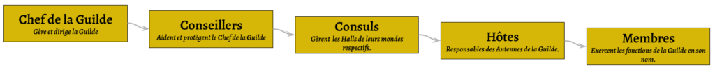La Guilde Pérégrine est considérée comme une milice indépendante par les nations des mondes dans lesquelles elle est implantée. Elle possède sa propre hiérarchie. Seul le Chef de la Guilde possède une autorité sur celle-ci, cette autorité s’étendant à travers l’Etherion dans son entièreté.