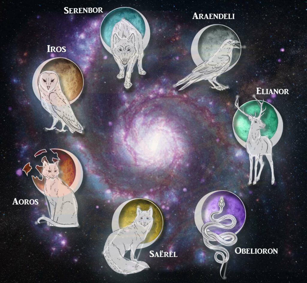 Ces Sphères manifestent des Astres Particuliers visibles depuis l'autre bout de l'Univers, formant des ensembles nommés Symboles. Chaque Sphère Primordiale possède son symbole, associé à la forme d'un animal : le Loup, le Corbeau, le Cerf, la Chouette, le Renard, le Chat et le Serpent.